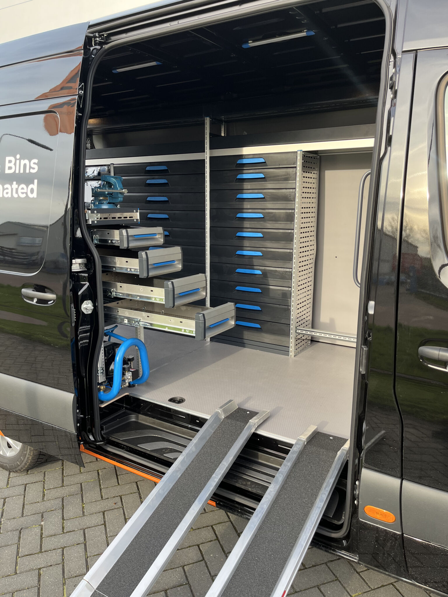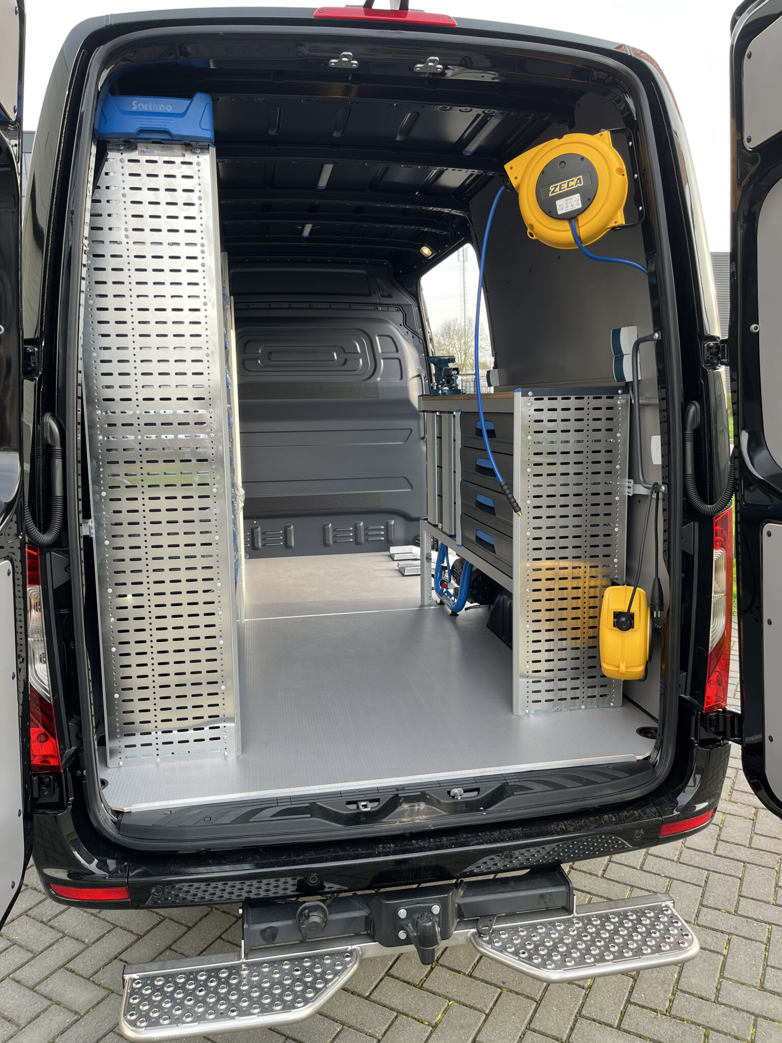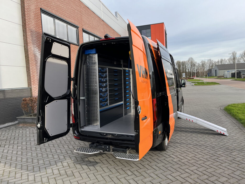 We hebben de bedrijfswagens van VHM Machinery uit Ens voorzien van een volledige uitrusting, waaronder Sortimo bedrijfswageninrichting, Sortimo oprijplaten, een robuuste RVS opstap, luchtvoorziening en stroomvoorziening van Victron.